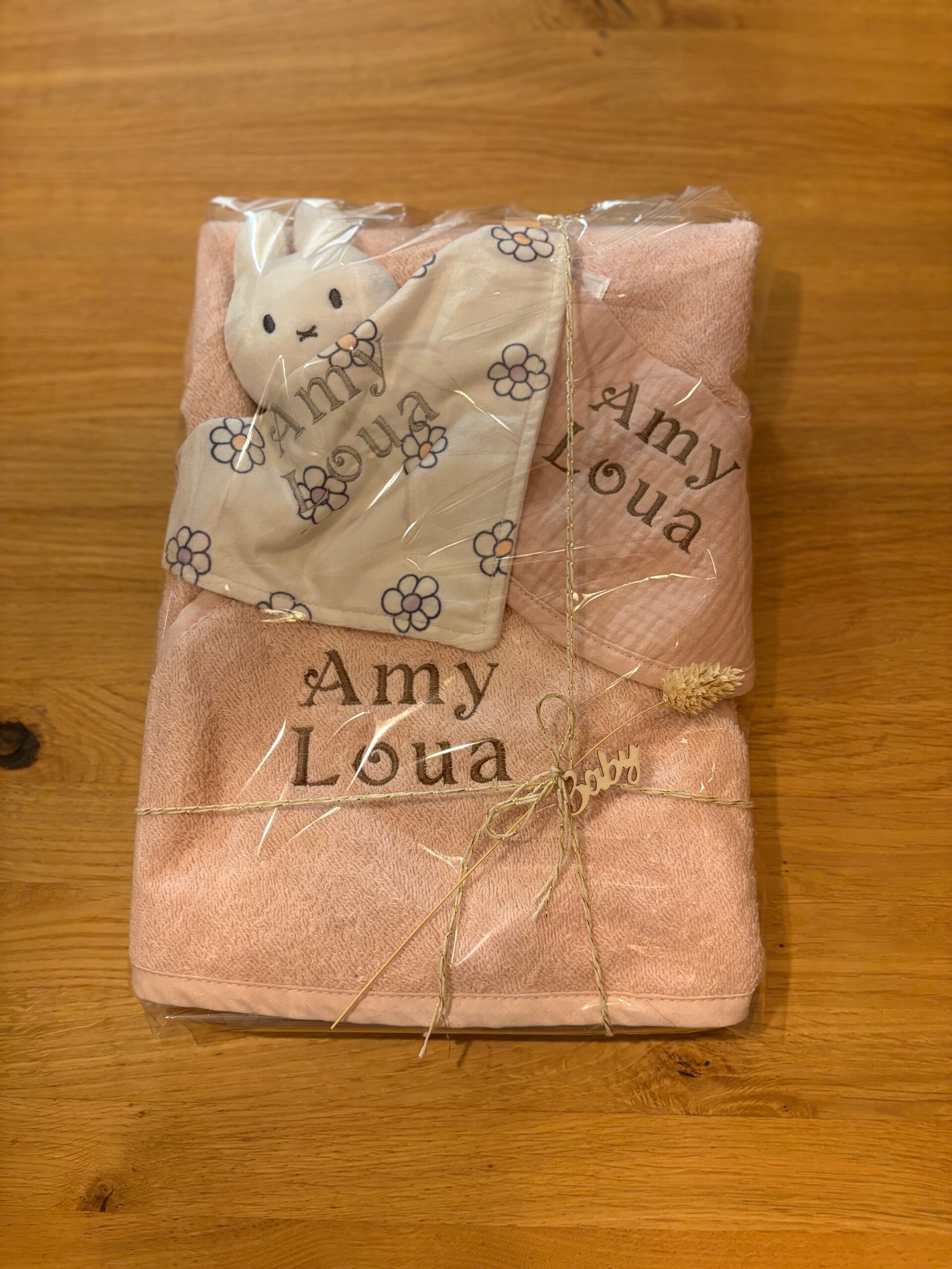 Op zoek naar een uniek en persoonlijk kraamcadeau? Het kraamcadeau pakketje met naam is de perfecte keuze! Dit prachtige pakket bestaat uit een zachte badcape, een handig slabbetje en een knuffeldoekje, allemaal voorzien van een persoonlijke naam. Een combinatie van praktisch en schattig, ideaal voor pasgeboren baby's. Geef een cadeau dat niet alleen van hoge kwaliteit is, maar ook een blijvende herinnering vormt. Bestel vandaag nog en verras de kersverse ouders met dit liefdevolle, gepersonaliseerde geschenk!