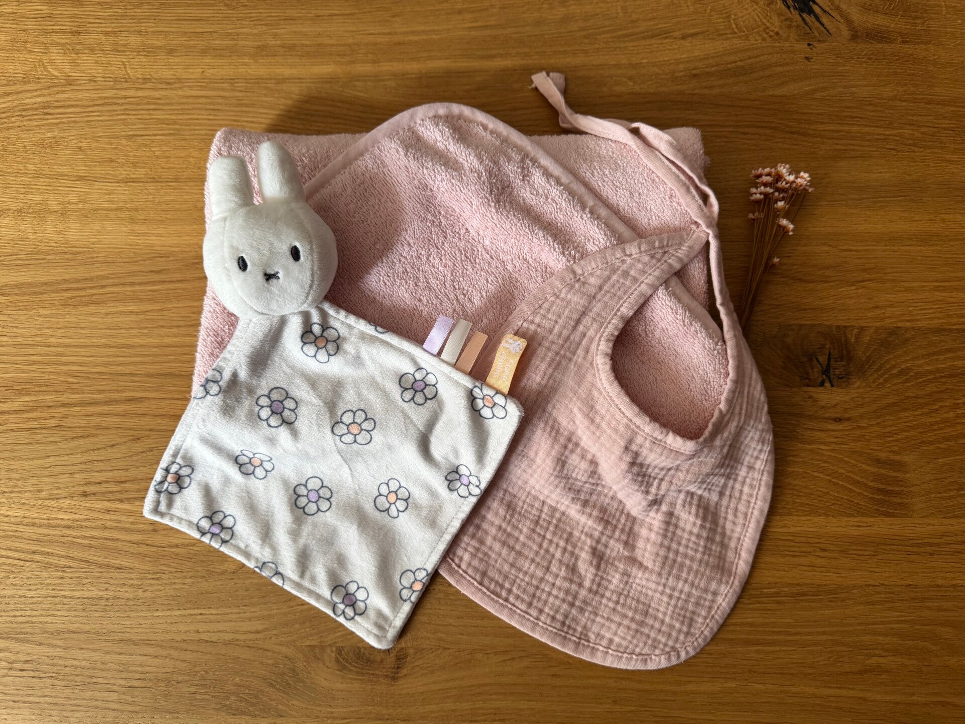 -Nijntje knuffeldoekje met bloemetjes met grijs borduursel OF knuffel konijn met bruin borduursel OF knuffel olifant met blauw borduursel.